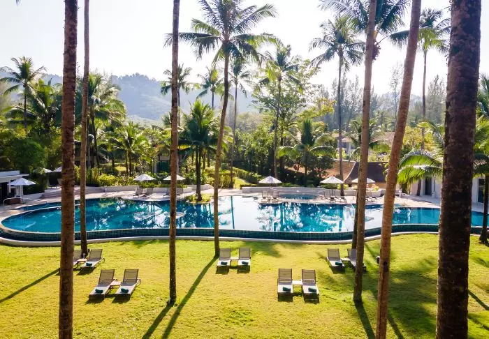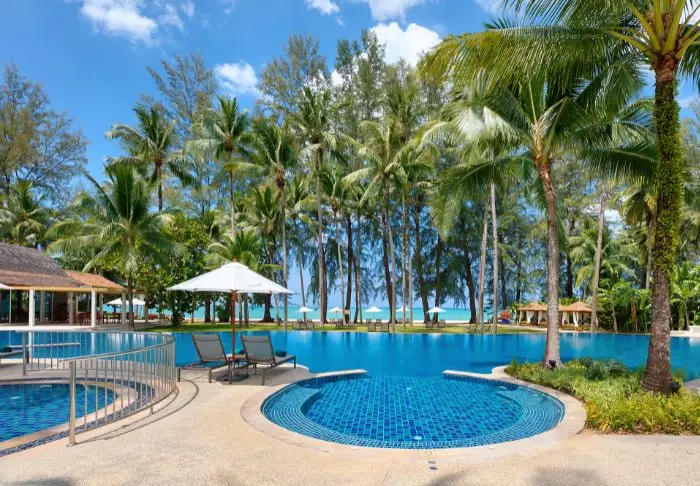 Foran frodige fjell og mellom vaiende kokospalmer finner du Outrigger Khao Lak Beach Resort, som ligger helt nede vedl Bangsak-stranden med utsikt over Andamanhavet.
