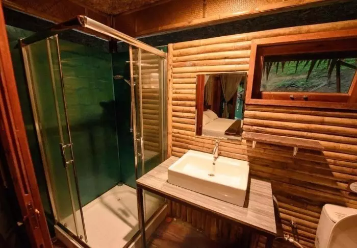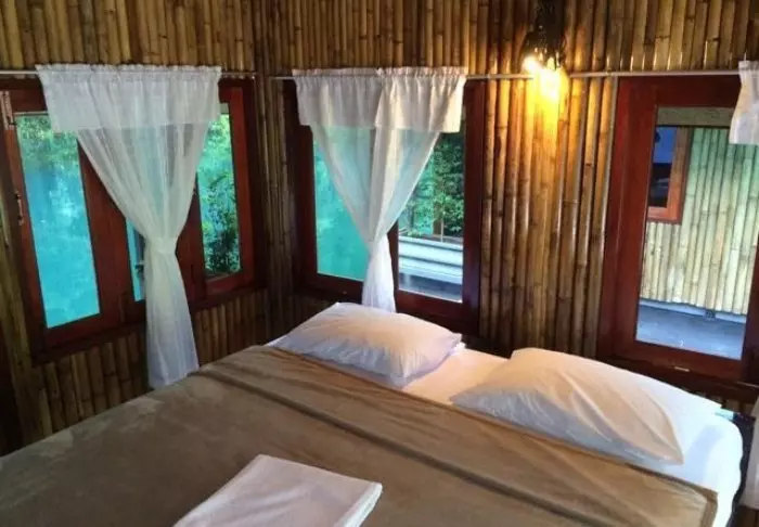 Det er totalt 30 bungalower, og vi bruker som utgangspunkt deluxe-rommene med plass til to personer. Disse er bygget i tradisjonell stil med vegger av vevd bambus, møbler i massivt tre og myke, hvite gardiner som sammen skaper en enkel og harmonisk atmosfære. Rommene har eget bad med kaldt vann i dusjen. Alle bungalower har myggnett, takvifte og egen veranda med utsikt over innsjøen. Det følger også med en kajakk og to redningsvester.