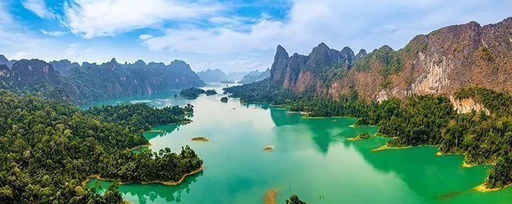 Etter frokost blir du hentet på hotellet, og du vinkler farvel til regnskogen og setter kurs mot Cheow Lan-sjøen, der mer enn 100 kalksteinsklipper stikker opp av det smaragdgrønne vannet.