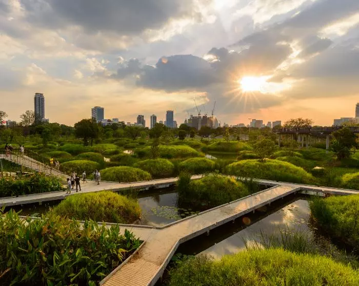 Hvis du foretrekker roligere og grønnere omgivelser, kan du besøke Lumpini- eller Benjakitti-parken. Du kan også krysse over til vestsiden av elven, der du kan oppleve en helt annen verden – uten skyskrapere og tutende tuk-tuker. Her kan du oppleve det mer tradisjonelle Bangkok, med en labyrint av kanaler der folk bor i hus på stylter.