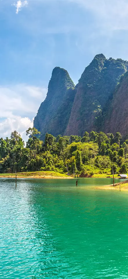 Khao Sok er en av Thailands største nasjonalparker med et areal på 739 km² – og sannsynligvis også en av de vakreste. Her finner du noen av landets største områder med opprinnelig, urørt regnskog, en eldgammel grønn oase som har ligget uberørt i millioner av år. De frodige omgivelsene og livgivende elvene huser et rikt dyreliv, blant annet gibbonaper, langurer og makakaper. Den lille dvergjorten har også hjem her, sammen med muntjak og serov. Er du riktig heldig, får du kanskje et glimt av den vakre, langhalede marmorkatten. For deg som er fugleinteressert, er det virkelig noe å glede seg til: neshornfugler og rødnakkede trogoner er blant de beboerne som skjuler seg i den tette jungelen.