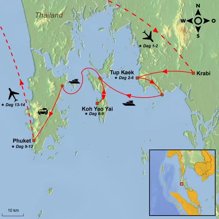 Reisen starter i Krabi, der du kan velge å bo ved Tup Kaek eller i Ao Nang. Her venter avslapning og en begivenhetsrik øyhopping til Andamanhavets vakreste og mest unike øyer og strender, som ligger som perler på en snor, blant annet Phra Nang Beach – en av Thailands fineste strender.