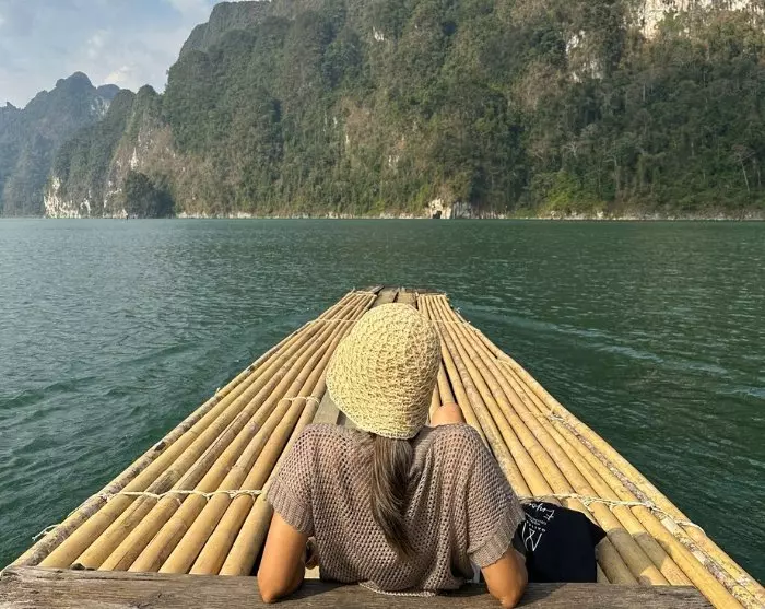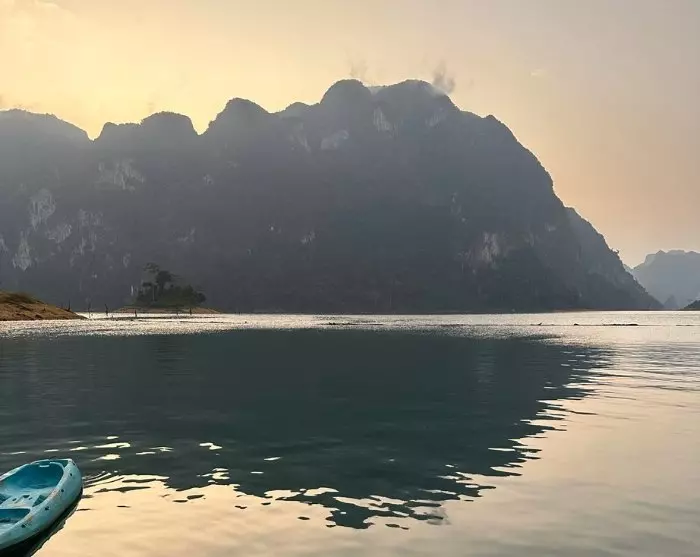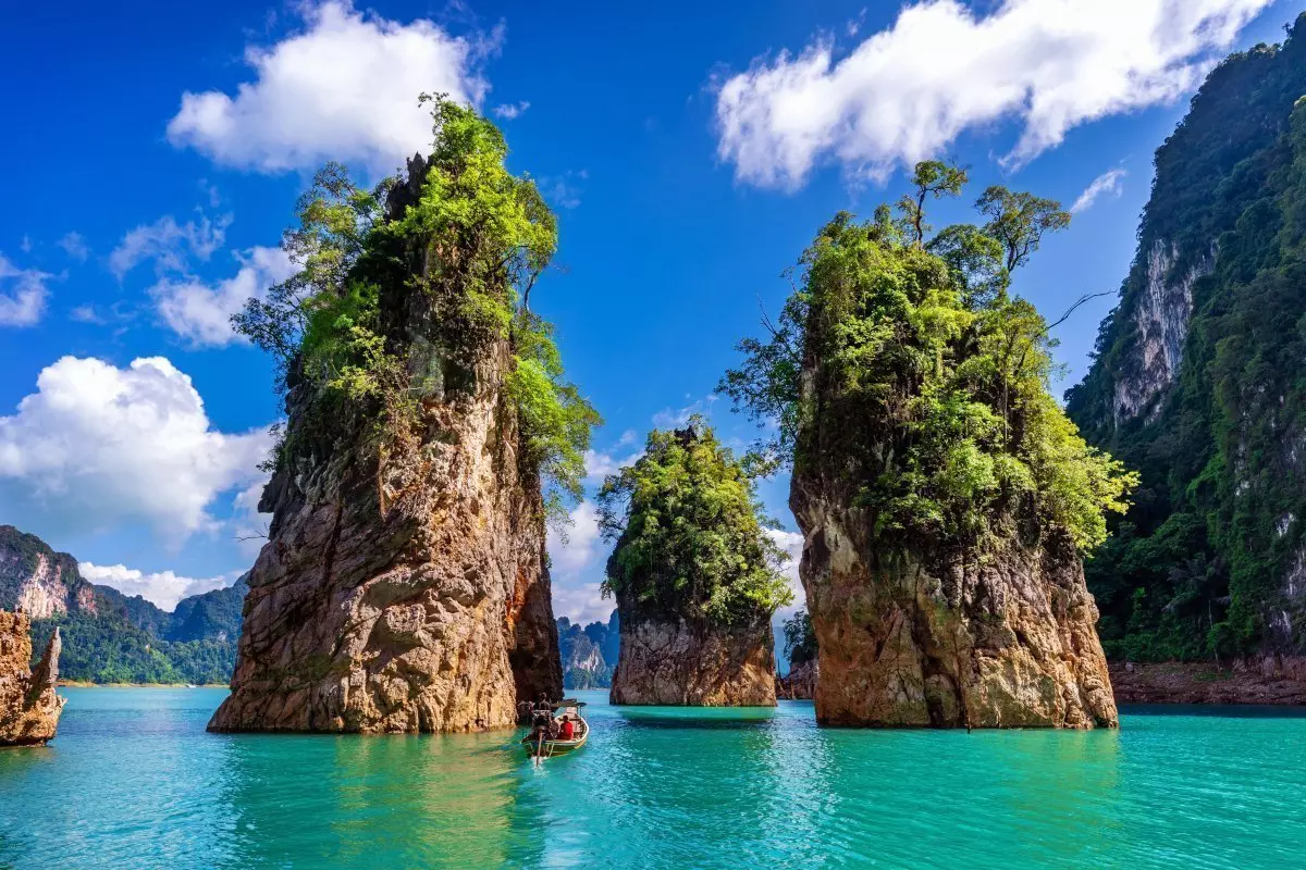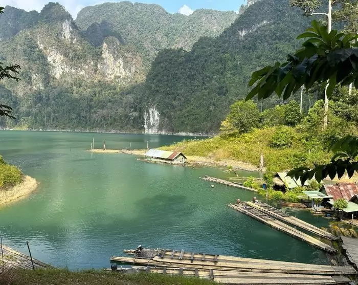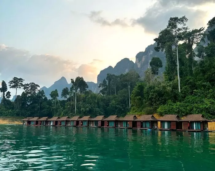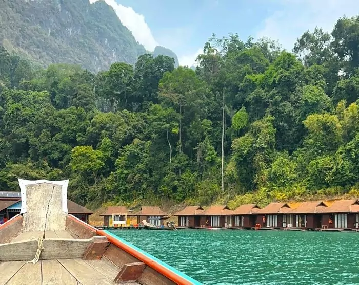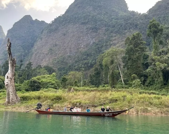 Deretter blir du kjørt til Ratchabrapa-kaien, like ved den imponerende demningen. Her går du ombord i en liten motorbåt, og den tar deg med ut på Cheow Lan-sjøen, der du kan beundre det majestetiske landskapet med de ikoniske kalksteinsklippene.