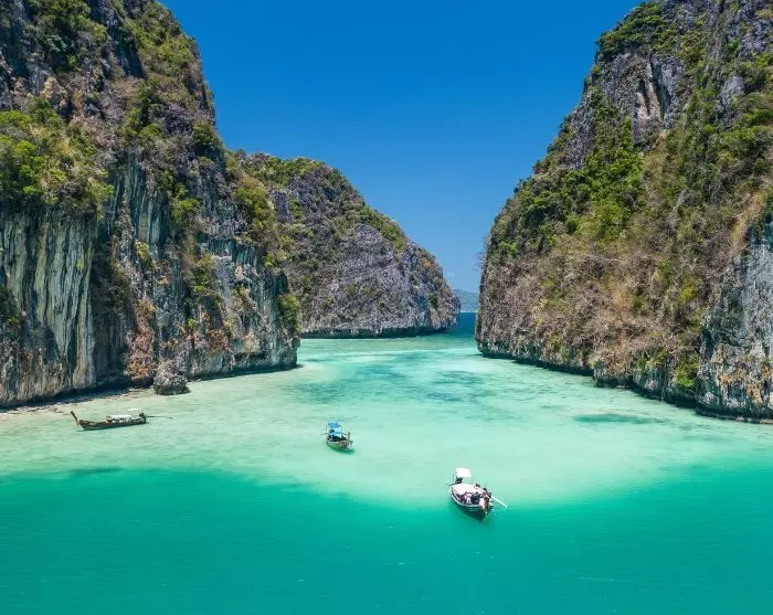 Enda lenger mot øst ligger de paradisiske Phi Phi-øyene, og dit kan du komme til på en heldagsutflukt der det er tid til både å bade, snorkle og slappe av ved de kritthvite sandstrendene.