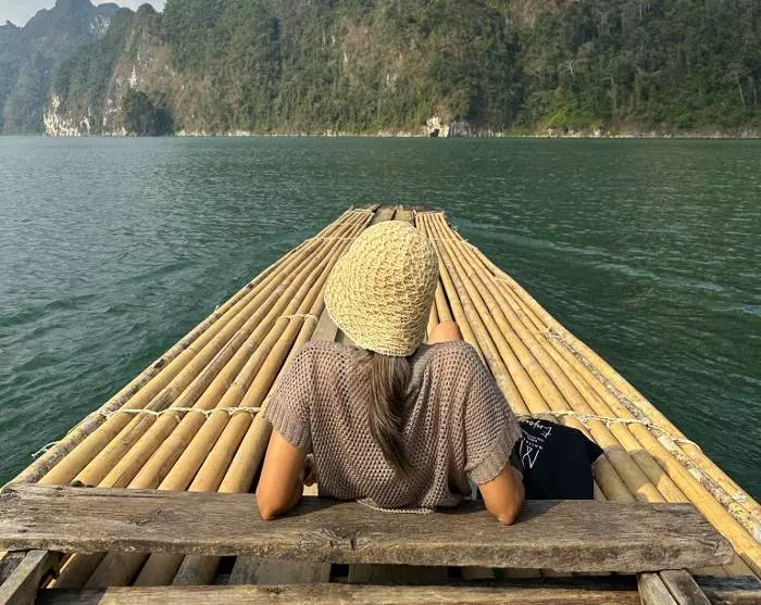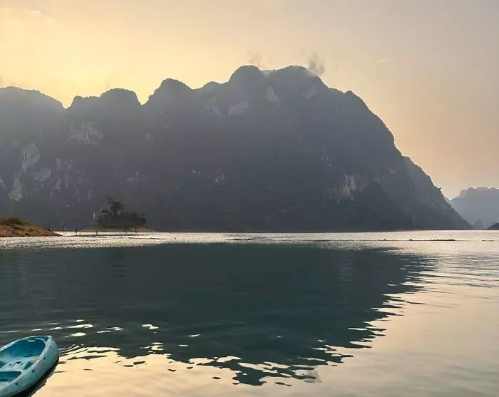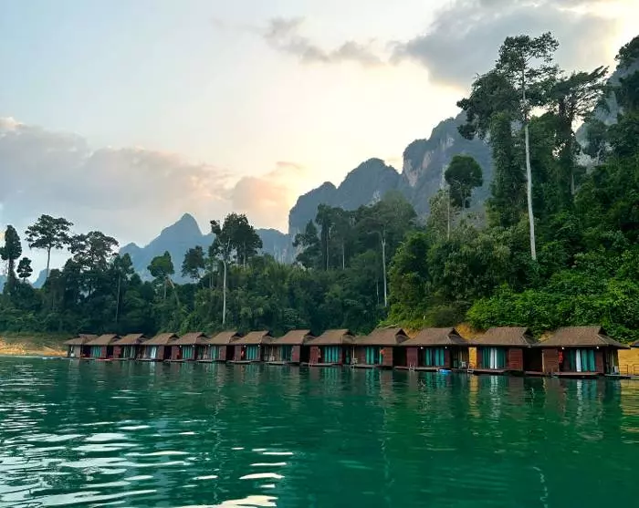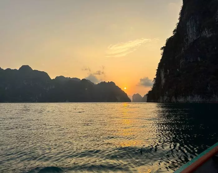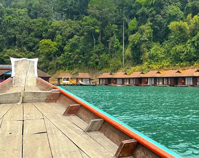 Deretter blir du kjørt til Ratchabrapa-kaien, like ved den imponerende demningen. Her går du ombord i en liten motorbåt, og den tar deg med ut på Cheow Lan-sjøen, der du kan beundre det majestetiske landskapet med de ikoniske kalksteinsklippene.