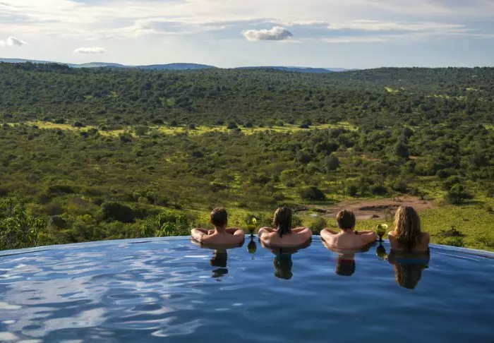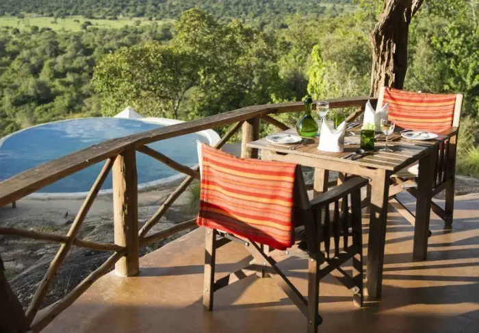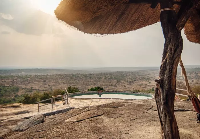 Fra lodgens svømmebasseng kan du nyte den fantastiske utsikten over dalen nedenfor, der bøfler, impalaer, vortesvin, sebraer og flere andre av savannens dyr gjerne samles ved vannhullet. På klippesiden kan du også være så heldig å få øye på en av de sky klippespringerne som lever der.