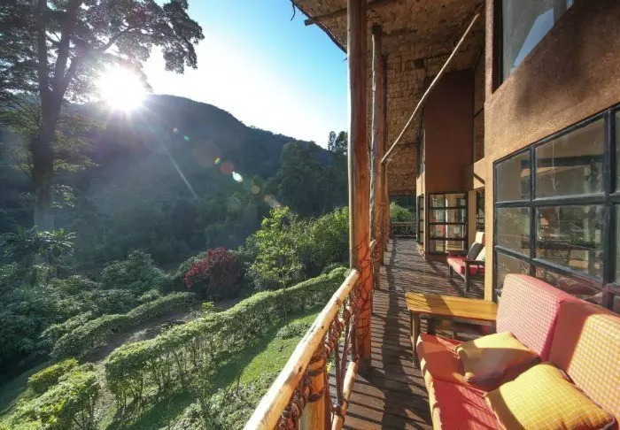 Hovedbygningen med restaurant, bar og loungeområde ligger på toppen av skråningen, og her har du ikke bare en helt fantastisk utsikt, men også ren, frisk luft fra skogen og dens mange trær mens du spiser maten din. Fra hovedbygningen går det en sti som fører deg rett til Rushaga-porten og inn i nasjonalparken.