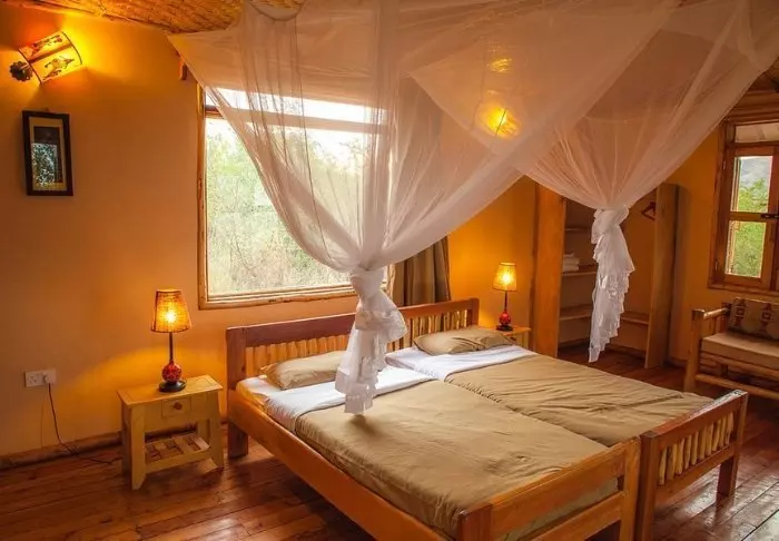 Lodgens stilfulle ”bandas”-hytter er bygget av tre og murstein og minner om tradisjonelle afrikanske landsbyhytter. Hver av dem er oppkalt etter skogens sjimpanser. Alle hytter har myggnett, eget bad og en balkong der du har en enestående utsikt over enten savannen eller Kyambura Gorge.