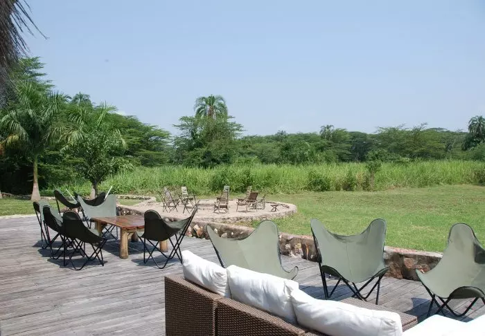 Bassenget er bygget på en platting av tre i forlengelse av plenen og området har både solsenger og utsikt. Om kvelden tennes det opp i bålet, og med en lokal øl i hånden kan gjestene utveksle historier fra dagens safari.