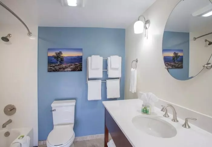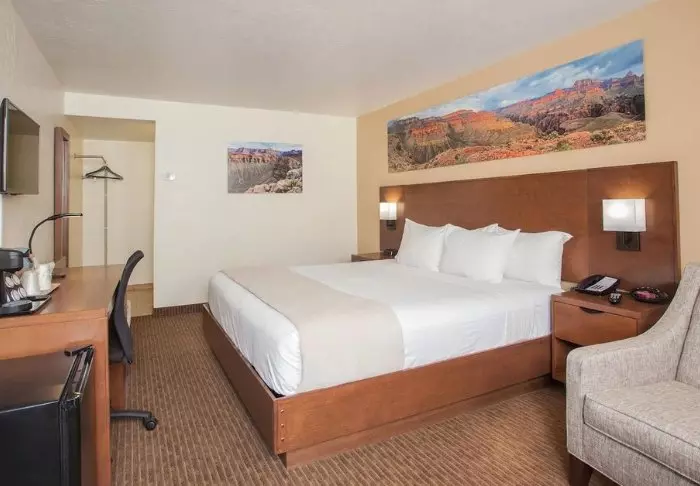 Red Feather Lodge består av både en hotelldel og en eldre motelldel. Du får et rom i hotelldelen, som ble renovert i 2019. De hyggelige rommene har justerbar aircondition/oppvarming, kaffemaskin, minikjøleskap, mikrobølgeovn og gratis Wi-Fi. Alle rom har eget bad med hårtørker.