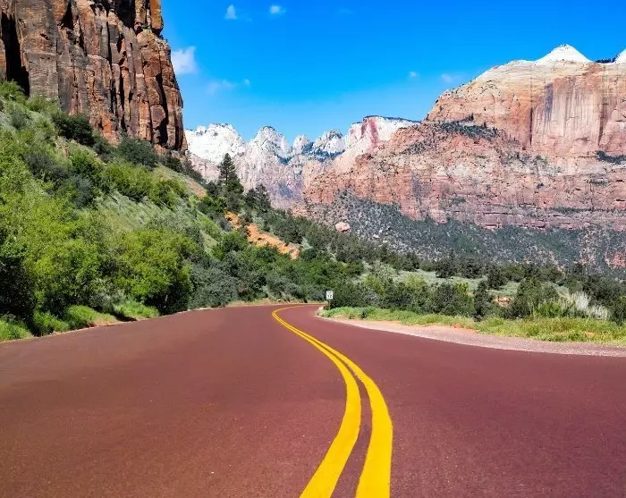 Denne strekningen kan du kjøre på en av reisens aller vakreste ruter. Når du forlater Bryce, kjører du sørover og svinger ut på Highway 9 (UT-9) ved Mt. Carmel Junction for å komme på Mount Carmel Highway. Jo nærmere du kommer Zion nasjonalpark, jo flottere blir landskapet og utsikten til rødlige fjell og dype daler.