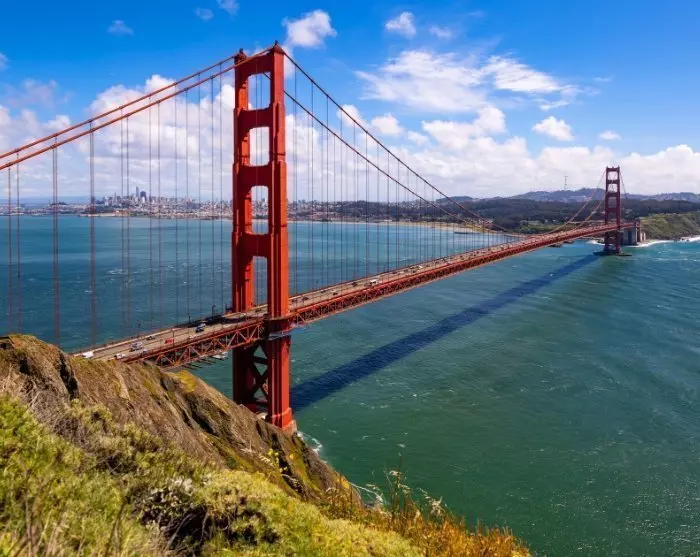 En av fordelene med Hop-On Hop-Off-bussen er at du får en tur over Golden Gate Bridge, hvor du kan gå av og nyte den fantastiske utsikten over den kuperte byen og Alcatraz Island som reiser seg i horisonten. Den ikoniske rødmalte stålbroen åpnet i 1937, og har siden vært et symbol for byen.