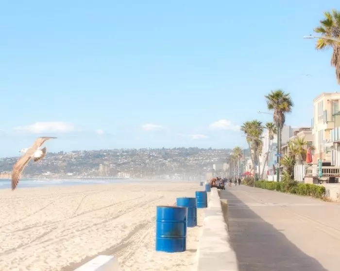 San Diego er spesielt kjent for livet ved havet og i bukten Mission Bay. Det er flott å leie sykkel og i rolig tempo følge boardwalken langs havet og fortsette rundt i bukten. Langs bukten er det små kafeer og restauranter der du kan ta en avslappende pause mens du titter på havet og forbipasserende.