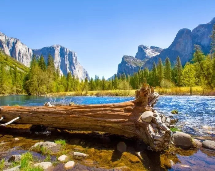Breskapte fjell rager opp i horisonten mens den iskalde og brusende Merced River skjærer seg vakkert gjennom Yosemite-dalen.