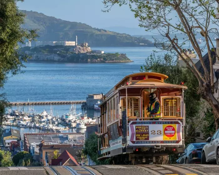 I dag kan du komme deg rundt til fots, med taxi eller kanskje du har lyst til å prøve en av byens historiske cable cars, som har fraktet folk over byens åser helt siden 1878. Du kan kjøpe både enkeltbilletter og dagsbilletter ved endestasjonene, og med den berømte Hyde-Powell-linjen kommer du lett til og fra Union Square og det kjente området Fisherman’s Wharf. Skal du gjøre det på ekte San Francisco-vis, så se om du klarer å skaffe deg en ståplass på siden av vognen og kjenne suget i magen når farten øker nedover bakkene.