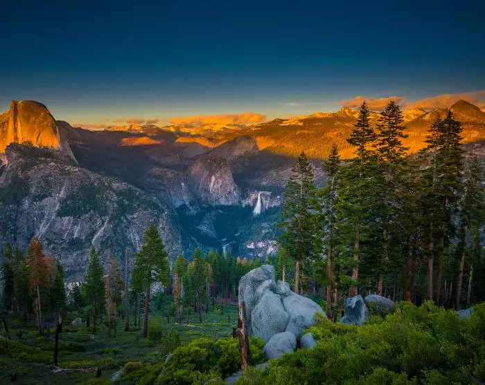Om sommeren bør du besøke det populære utsiktspunktet Glacier Point, for her har du flott panoramautsikt over parkens fjell og fosser. Ekstra fint er det å dra hit opp før solnedgang og se hvordan den enorme klippen Half Dome farges rød av solen. Kort tid etter solnedgang vil du i tillegg bli belønnet med en helt magisk stjernehimmel. Her i 2200 meters høyde ser det ut som om den er rett over hodet ditt. Hvis du drar hit opp med en enveis bussbillett om dagen (bestilles på Visitor Center), kan du gå den vakre turstien, Four-Mile-Trail tilbake til bunnen av parken.
