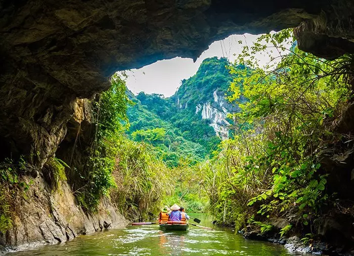 I nærliggende Trang An går du om bord i en sampan – en liten, flat trebåt. Len deg tilbake og nyt den 2,5 timers båtturen mens du vugger stille på elven gjennom et malerisk landskap av bølgende rismarker og grønnkledte kalksteinsklipper som ruver mot himmelen. Landskapet står på UNESCOs verdensarvliste og kalles Ha Long-bukten på land. Underveis er du innom flere grotter og kan nyte det rike fuglelivet. Når du kommer i land igjen går turen tilbake til Hanoi.
