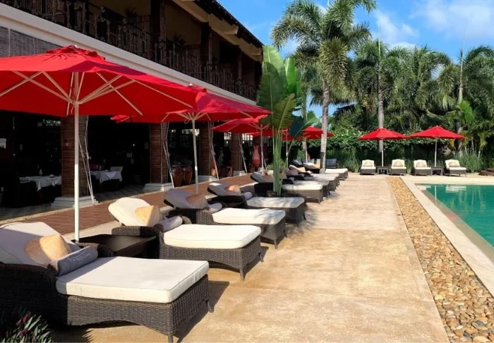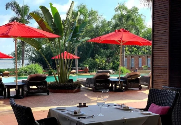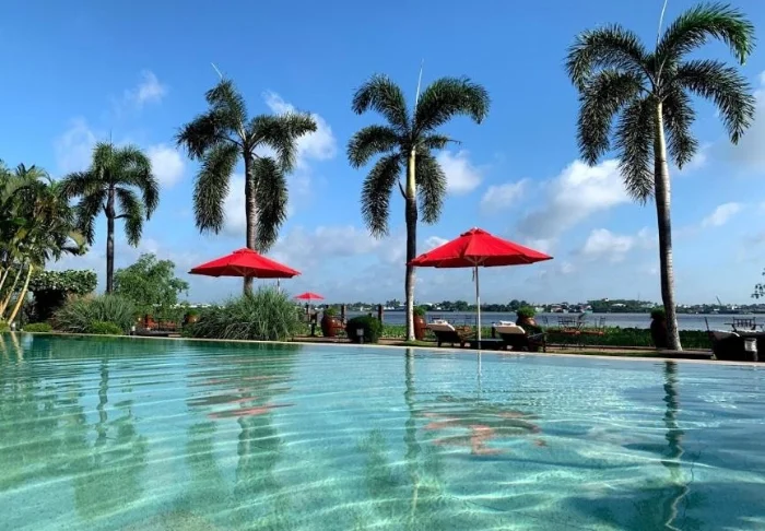 Resortets basseng har utsikt over elven, og her finner du både solsenger og parasoller. I Oasis Spa kan du nyte avslappende behandlinger omgitt av lotusdammer og frukttrær.