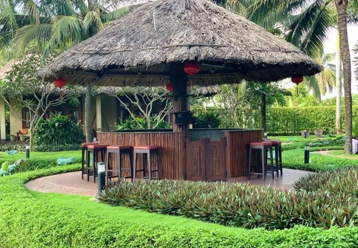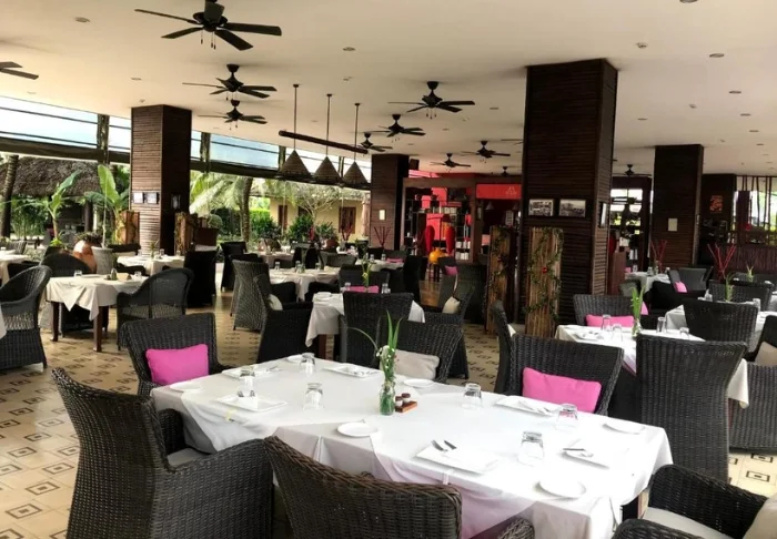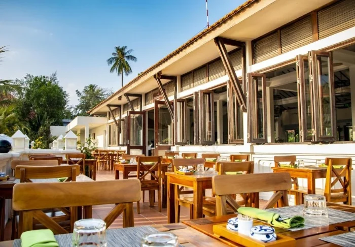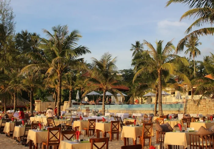 Fra restauranten og baren er det utsikt til bassenget og stranden. Restauranten serverer både vietnamesiske og vestlige retter – alt tilberedt med lokale, bærekraftige ingredienser. Her er det noe for alle – også vegetarianere og veganere.