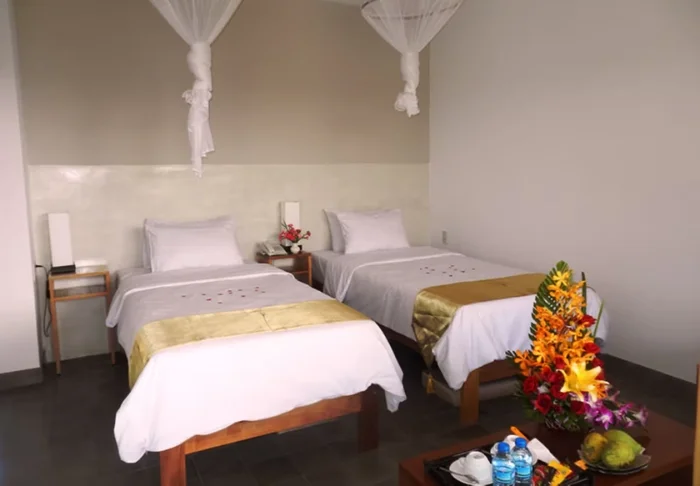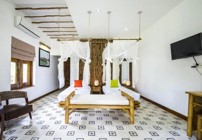 Garden View-rommene ligger i små paviljonger midt i den frodige hagen. De er lyse, innredet med bambusmøbler, myggnett over sengene og fargerike puter som skaper en varm og innbydende atmosfære. Store vindusflater slipper hagen inn i rommet, og fra den private terrassen kan du nyte stillheten og utsikten til de grønne omgivelsene.