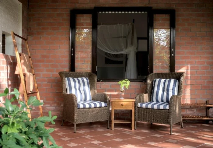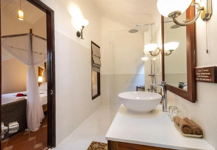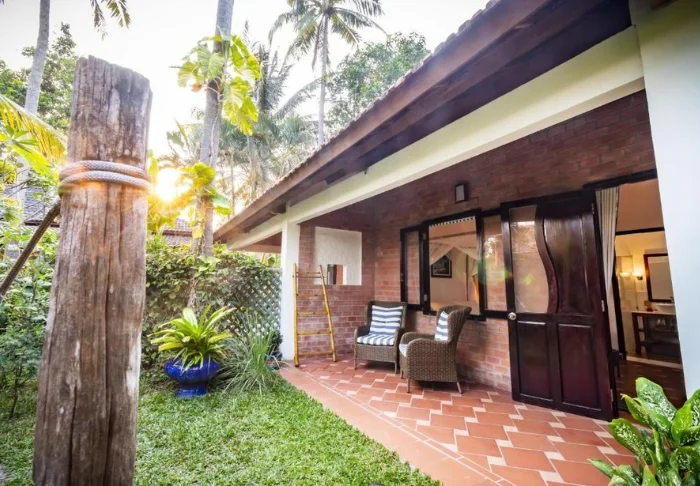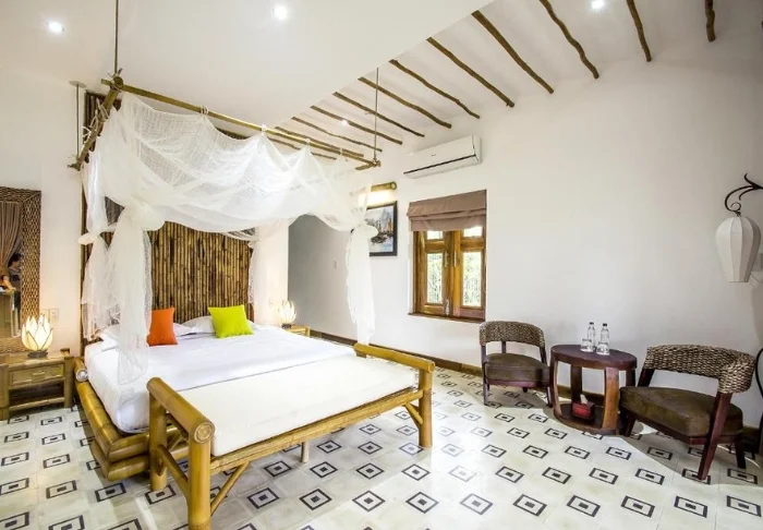 Hver av resortens 19 bungalower er oppdelt i to luksuriøse og store rom. Hvert rom har eget bad og terrasse med utsikt over hagen. Rommene er smakfullt innredet med lokale tresorter, stein, keramikk og fliser med tradisjonelle mønstre som gir dem en helt særpreget sjarm.