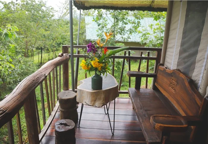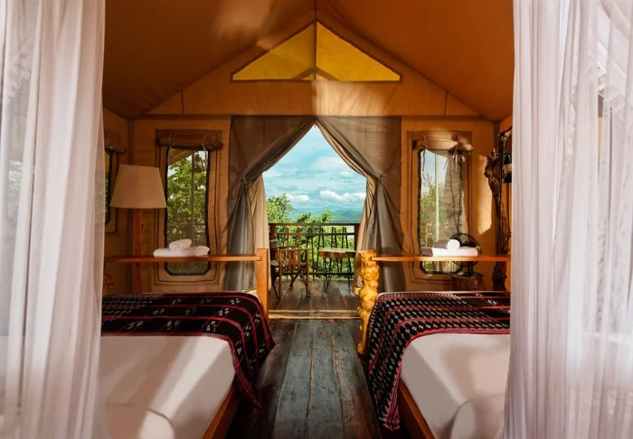 Overnatting skjer i luksustelt, som er spesialdesignet for tropene. Teltene ligger hevet over bakken på en treplattform og har utsikt over Ben Cu-strømstedet. Teltene er forbundet med lodgens hovedbygning via et nettverk av gangbroer. Alle teltene har enten dobbeltseng eller to enkeltsenger, eget bad, minibar, vifte og klimaanlegg. Foran teltet er det en deilig balkong med et par stoler, hvor man kan nyte soloppgangen over elven og høre gibbonapene rope.