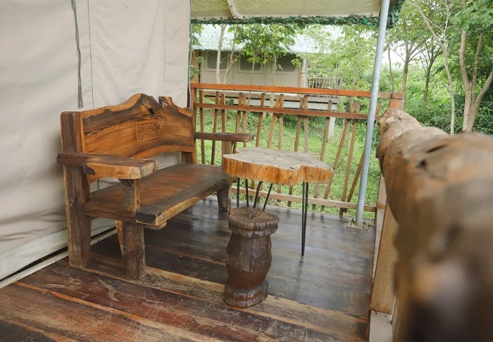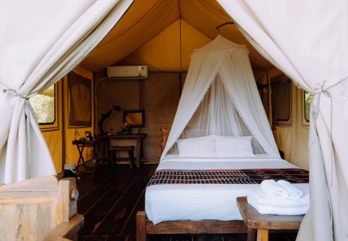 Campen har kun 19 rom fordelt på 4,8 hektar. Her skal du ikke forvente femstjerners luksus, men heller tusenstjerners øyeblikk under åpen himmel. Alt er bygget med fokus på bærekraft og minimal påvirkning av landskapet, slik at du kan fordype deg i naturen uten forstyrrelser. Strømmen kommer fra solenergi, sjøen gir svalende avkjøling på varme dager, og om natten er det lyden av sikader og hanegal som skaper stemningen eller vekker deg ved daggry. Lak Tented Camp er full av små overraskelser.