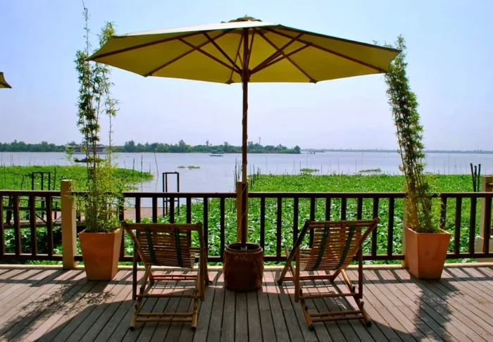 River View-rommene ligger i første etasje i hovedbygningen, med flott utsikt over Mekongelven og de nærliggende plantasjene. Innredningen er i samme stil som Garden View-rommene, men her har du en privat balkong med loungemøbler der du kan slappe av og følge livet på elven mens båtene glir forbi.