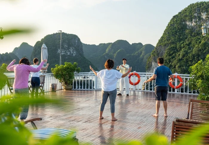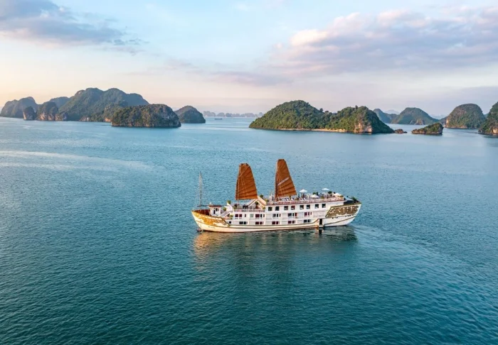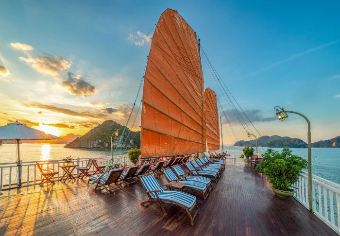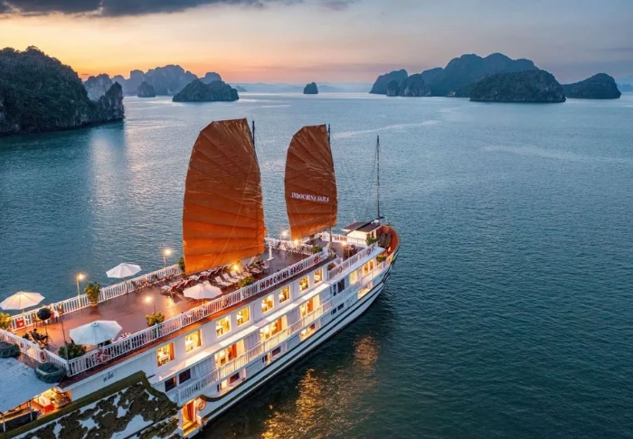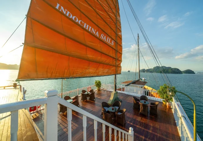 Indochina Sails tar deg med ut på de rolige vannene i Ha Long-bukten, hvor du seiler mellom kalksteinsklipper og små grønne øyer. Cruiset kombinerer klassisk sjarm fra treskip med moderne fasiliteter, slik at du kan nyte både omgivelsene og avslappende timer om bord.