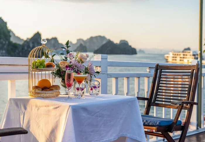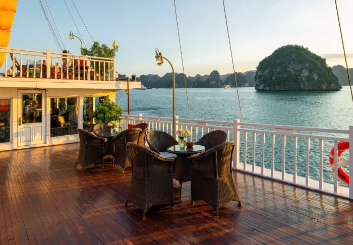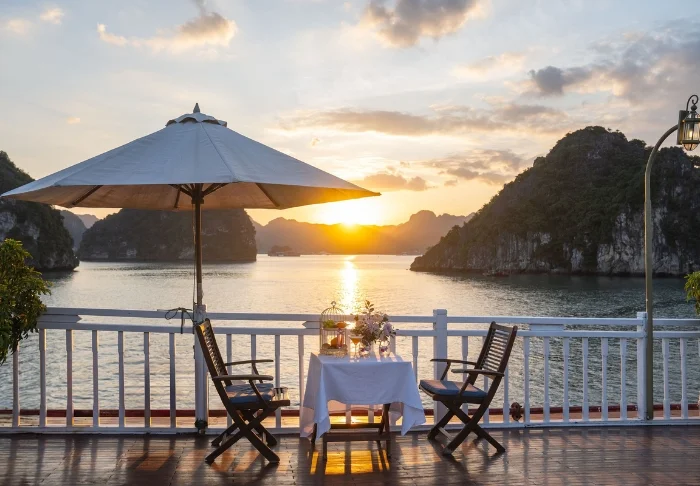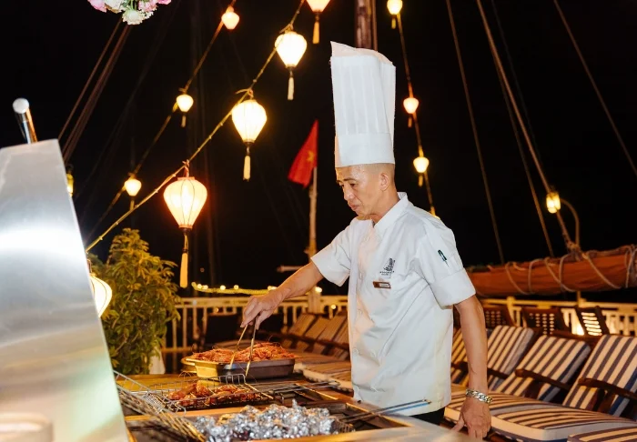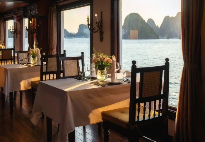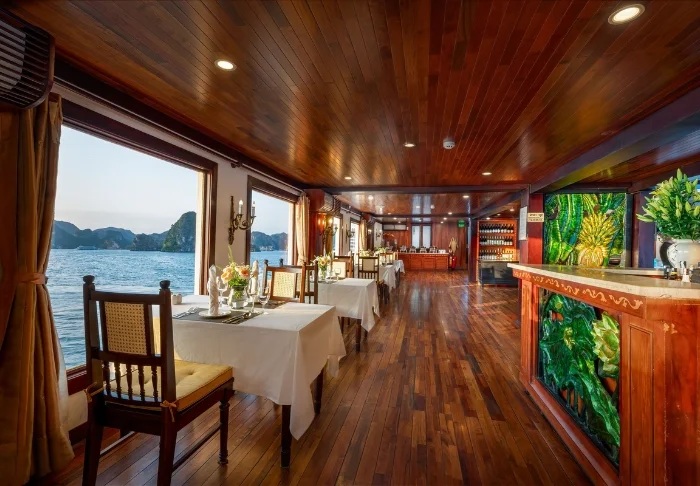 Restauranten byr på retter fra både det vietnamesiske og det internasjonale kjøkken, laget med råvarer av høy kvalitet. Her råder en elegant atmosfære, og middagen på dekket med solnedgangen som bakteppe blir et av høydepunktene på reisen.