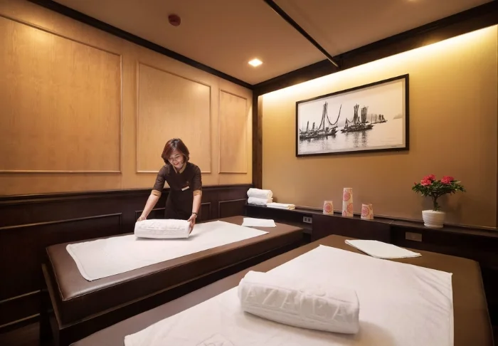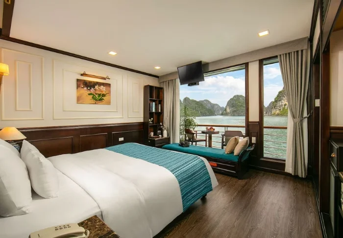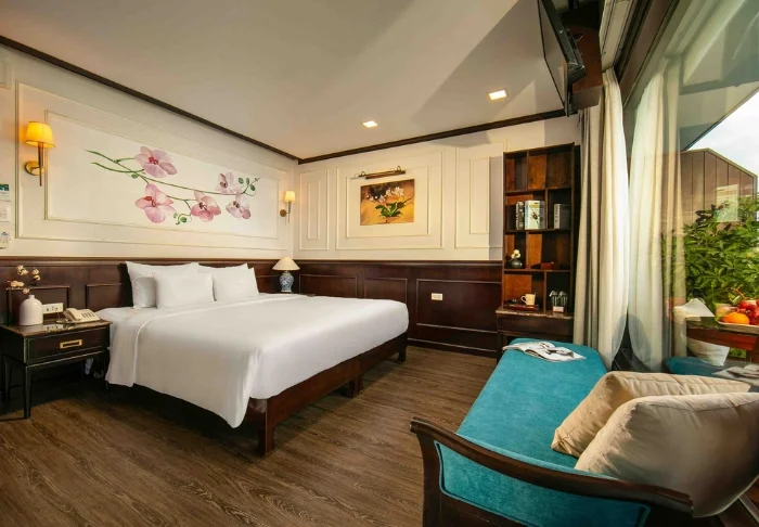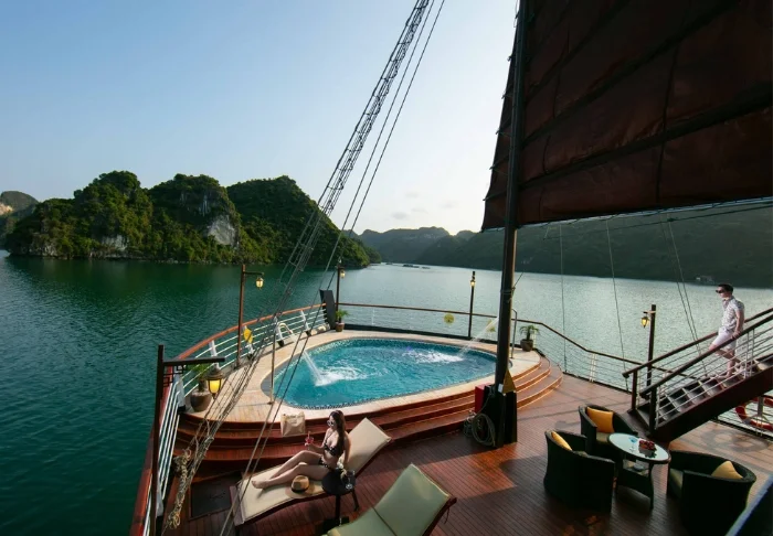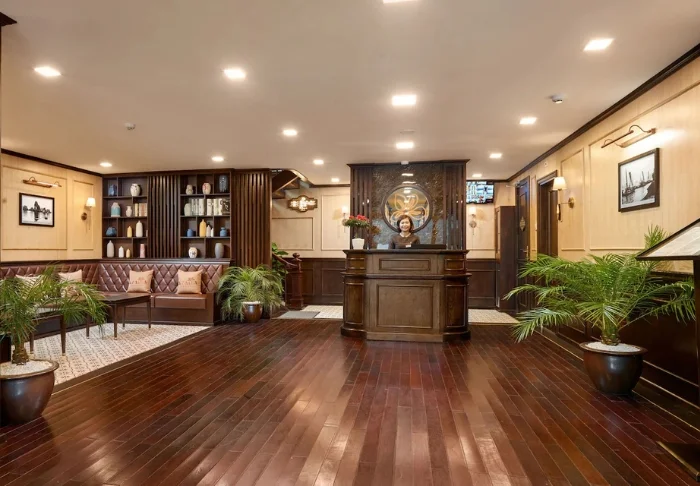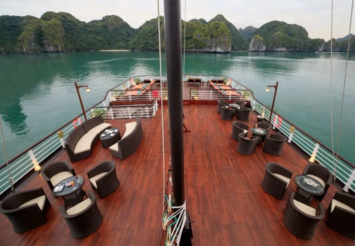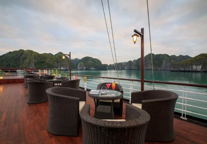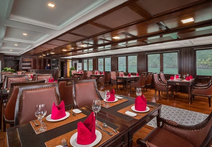 Skipet har naturligvis også en restaurant som serverer vietnamesiske spesialiteter og internasjonale retter. Måltidene nytes i rolige omgivelser og blir raskt et naturlig samlingspunkt etter dagens opplevelser.