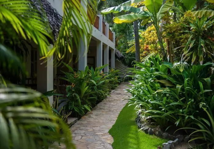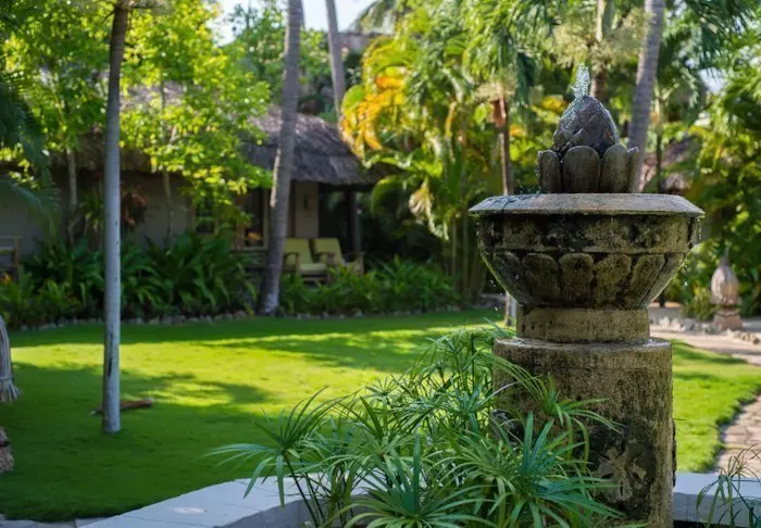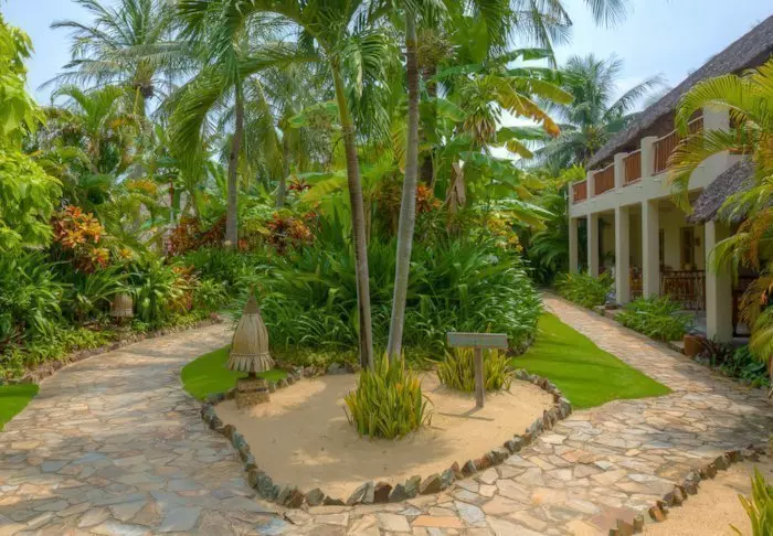 Resortens 30 rom ligger spredt som bungalower i den frodige hagen. Her er det rislende vand, fargerike blomster og små skyggefulle hjørner der du kan slappe av.