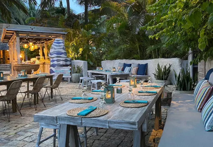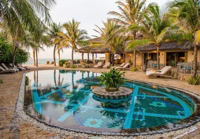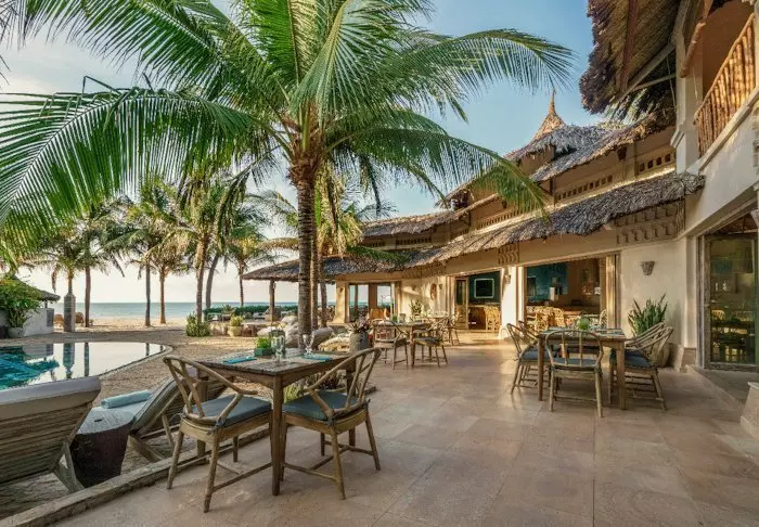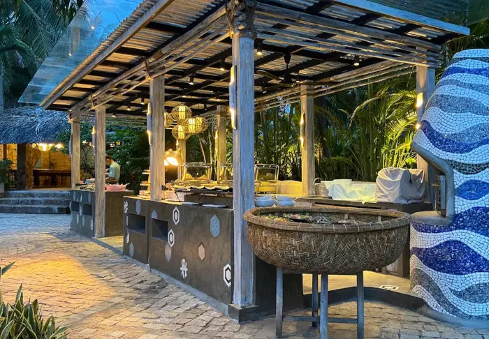 Fra restauranten og baren er det utsikt til bassenget og stranden. Restauranten serverer både vietnamesiske og vestlige retter – alt tilberedt med lokale, bærekraftige ingredienser. Her er det noe for alle – også vegetarianere og veganere.