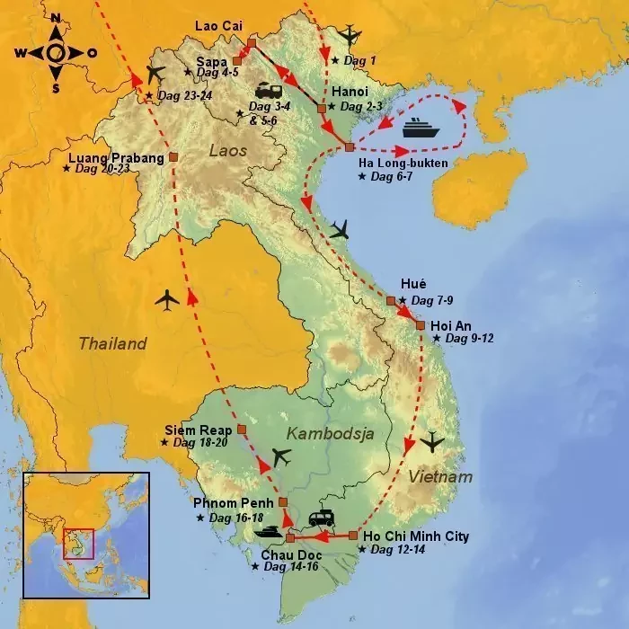 Reisen starter i eventyrlige Vietnam. Flinke, lokale engelsktalende guider presenterer deg for de største severdighetene i dette langstrakte, vakre landet, og underveis har du tid til fri disposisjon, slik at du kan gå på oppdagelsesferd på egenhånd eller bare slappe av. Fra Vietnam seiler du på den mektige Mekong-elven til Kambodsja. Her opplever du landets største by og hovedstad, Phnom Penh, før turen går videre til Siem Reap. Et besøk ved Ankor Wat og de omkringliggende ruinene vil gi deg reiseminner for livet. Reisen slutter i Laos’ gamle kongeby, Luang Prabang. Roen, freden og idyllen i Luang Prabang er akkurat det du trenger for virkelig å kunne fordøye de siste ukenes fantastiske opplevelser i Indokina.