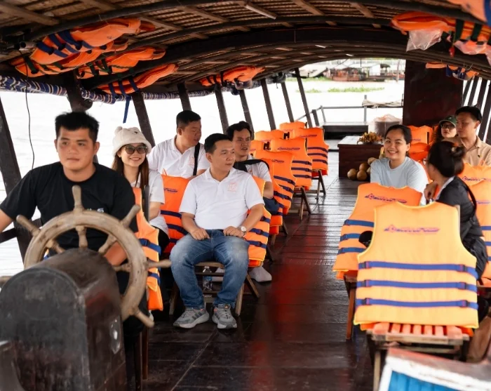 Etter omtrent 2,5 timers kjøring ankommer du byen Cai Be. Her går du om bord i en båt og seiler ut på det frodige Mekongdeltaet. Du besøker lokale verksteder der dyktige håndverkere lager produkter av kokos. Deretter fortsetter du i en liten sampan – en tradisjonell, håndrodd trebåt – gjennom Mekongdeltaets smale, svingete kanaler.