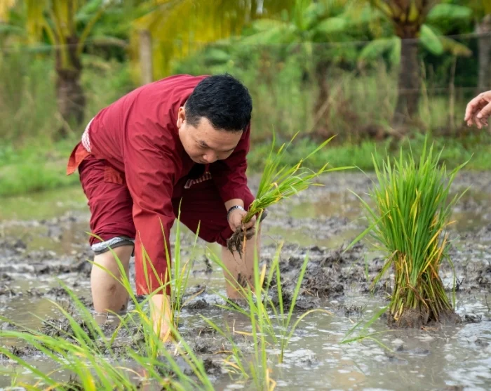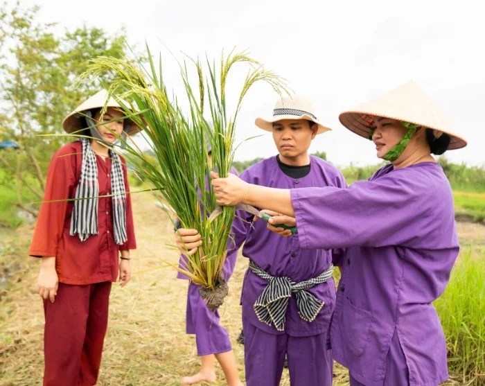 Deretter fortsetter du til vårt sosiale bærekraftsprosjekt i Vinh Long, som er startet av vår lokale samarbeidspartner. Her venter en rolig spasertur gjennom landsbyen, mens guiden din forteller mer om prosjektet underveis. Du får også mulighet til å ta del i det tradisjonelle landbrukslivet. Sammen med lokale bønder prøver du deg på risdyrking – enten ved å plante de spede risplantene eller ved å hjelpe til med innhøstingen, avhengig av sesongen. Det er en lærerik og jordnær opplevelse som gir deg et unikt innblikk i hverdagen på landsbygda i Vietnam og i arbeidet bak et bærekraftig jordbruk. Når du deltar på denne turen, er du samtidig med på å bidra til familiene i Vinh Long, siden en prosentandel av reisens pris går direkte til prosjektet, som du kan lese mer om her.