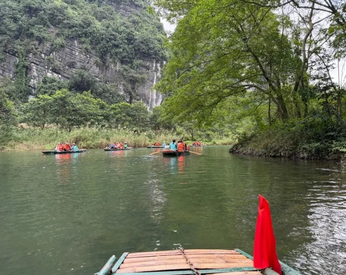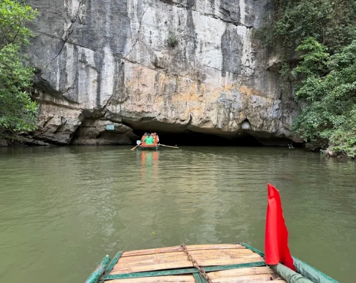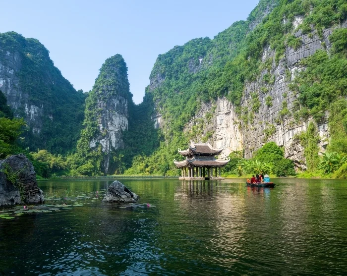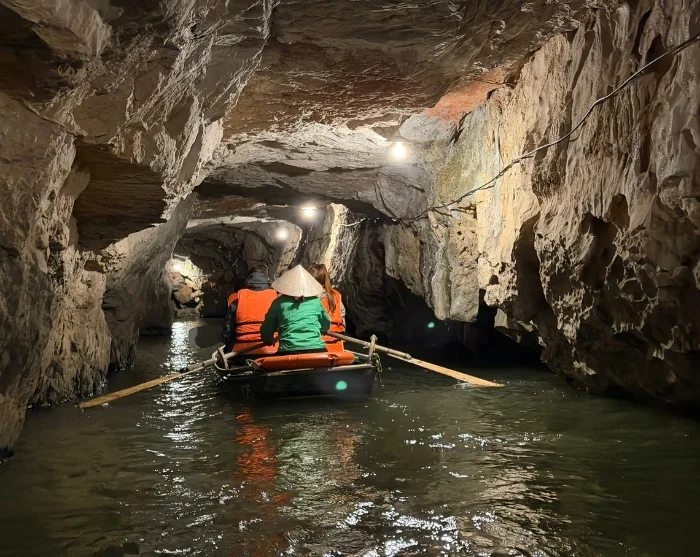 Deretter sykler du tilbake til startpunktet – turen tar bare noen få minutter. Her setter du fra deg sykkelen, og blir kjørt videre til Trang An-grottene, et spektakulært naturområde med dramatiske klippeformasjoner og skjulte huler. Du går om bord i en tradisjonell sampan, som roes stille på den rolige elven gjennom et nettverk av grotter og huler, blant annet Lam Cave, Vang Cave, Dai Cave og Thanh Truot Cave. Underveis passerer du også templene Cao Son, Suoi Tien og Vu Lam, samt Skull Island, som ble brukt som innspillingssted for filmen “Kong: Skull Island” i 2017.