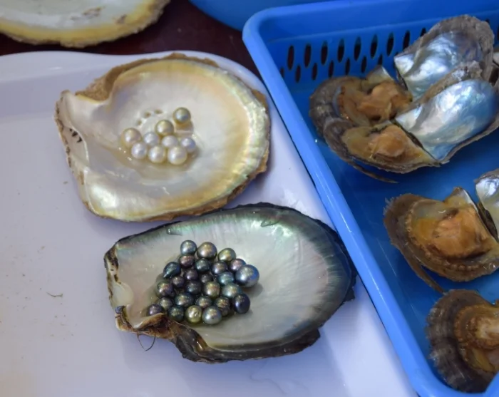 Senere legger båten til ved en lokal perlefarm, hvor du får et innblikk i tradisjonell perledyrking.