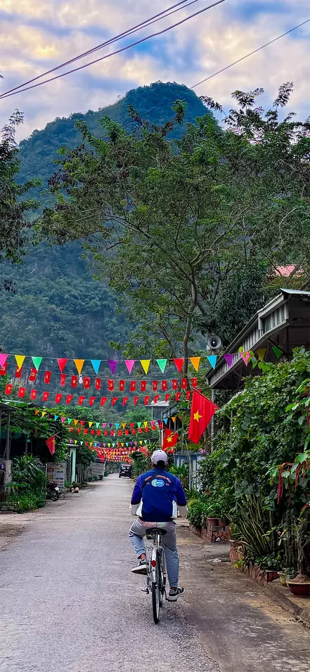Etter frokosten kjører du mot Gia Vien-distriktet, hvor dagens sykkeltur på ca. 14 km starter. Her setter du deg på sykkelen og tråkker av gårde i rolig tempo langs små veier, forbi grønne rismarker og lokale landsbyer på vei mot Van Long naturreservat. Underveis blir det tid til fotostopp, blant annet ved en lokal katolsk kirke, før ruten fortsetter videre gjennom det åpne landskapet. Området rundt Van Long er kjent for sine stille våtmarker, markante kalksteinsklipper og rike fugleliv – alt sammen en vakker ramme for turen.