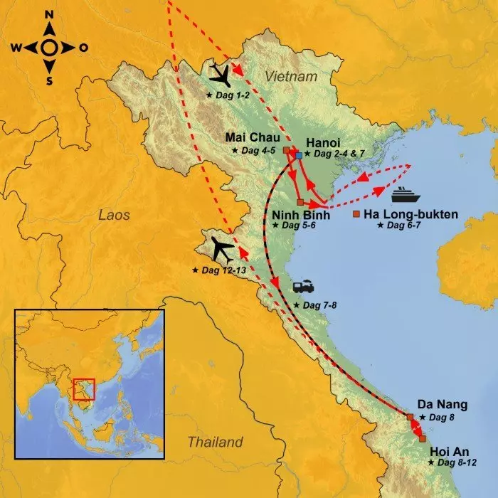 Det nordlige Vietnam byr på store opplevelser, både kulturelt og naturmessig. Hovedstaden Hanoi er en nydelig blanding av gammel historie og moderne travelhet, vakre kolonitidsbygninger og lokale markeder med eksotisk frukt og grønt. I Mai Chau opplever du etniske landsbyer, rismarker og høydedrag hvor du kommer tett inn på hverdagen på landet. Fra Tam Coc opplever du grønnkledde fjell som stikker opp av et flatt åkerlandskap. Deretter venter et minikrysstokt mellom Ha Long-buktens magiske klipper. Reisen avrundes med noen avslappende dager i Hoi An.