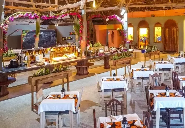 På hotellets restaurant serveres deilige lokale retter med fisk og skalldyr, samt varierte retter fra det afrikanske, indiske og arabiske kjøkkenet. Maten er frisk og vellaget. Frokosten består av buffet, i tillegg til egg og pannekaker servert direkte fra kjøkkenet – akkurat slik du vil ha det.