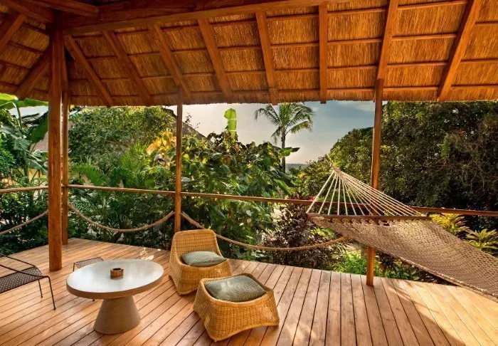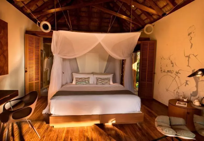 Innredningen i alle bungalowene er inspirert av moderne afrikansk arkitektur og har fokus på bærekraft. Her finner du alt du ønsker: egen stor og fint møblert terrasse, innen- og utendørs bad, te- og kaffefasiliteter, gratis Wi-Fi, aircondition, flatskjerm-TV osv., men samtidig er stemningen her utrolig avslappet og vennlig.